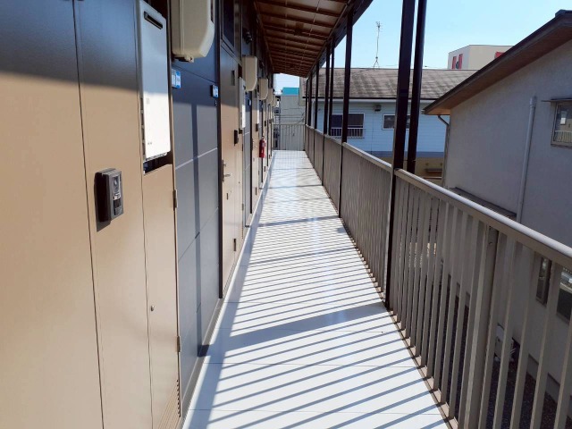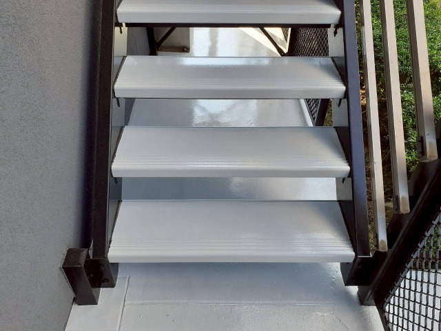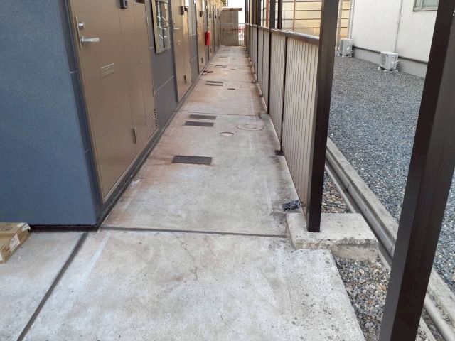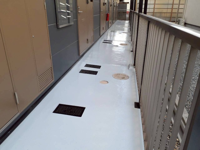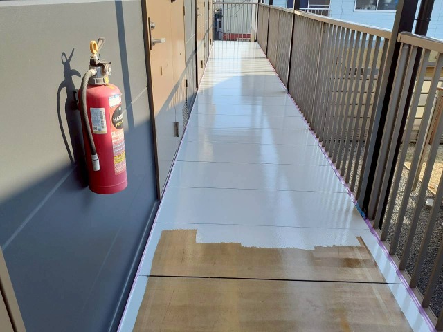 塗装箇所:通路土間 施工中 上塗り 使用材料:日特 ユータックU-13 外の環境に耐性のある塗床材です。