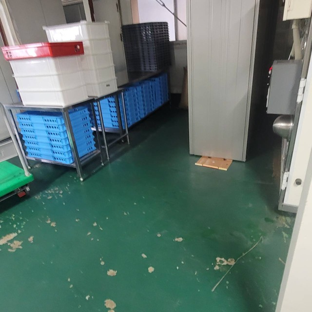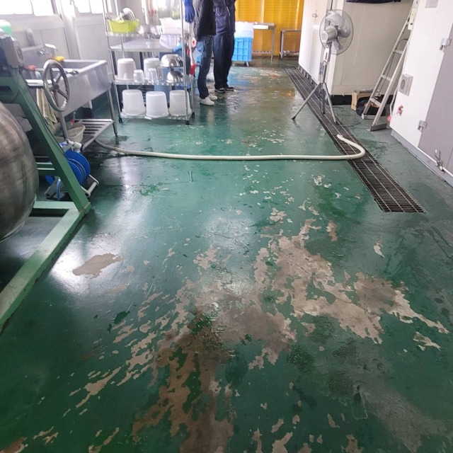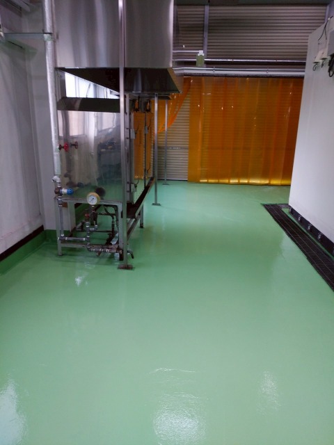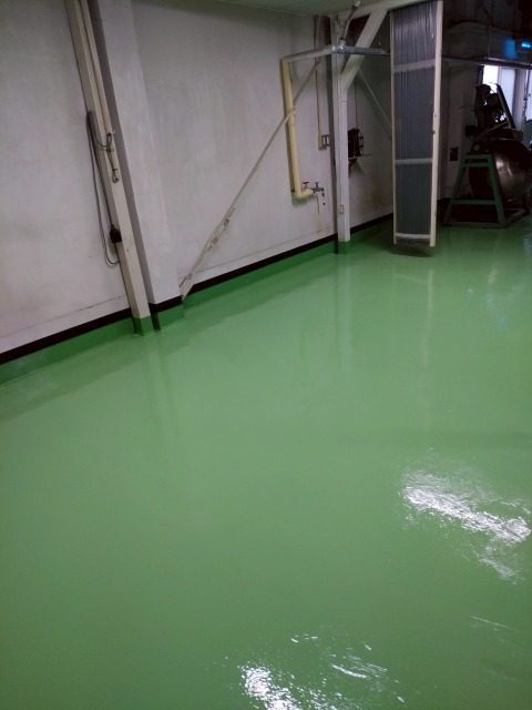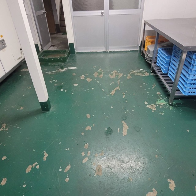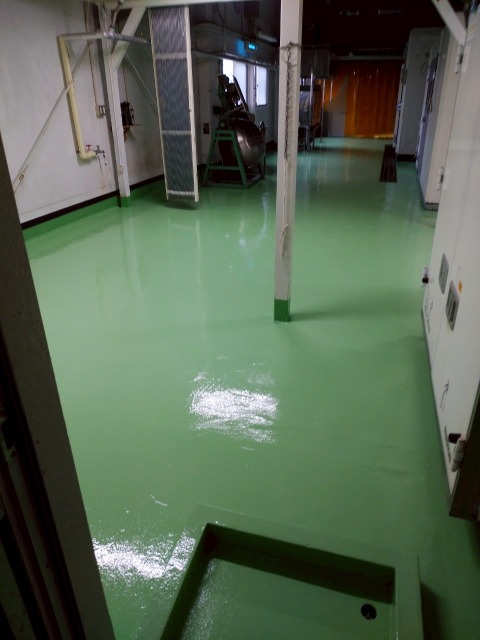 使用材料:ユータックWE-400N 低温時の乾燥性に優れており、耐薬品性や耐摩耗性に優れた高光沢の床面が得られます。 また、水性のため臭気が少なく、施工時の引火の危険性もないため安全です。